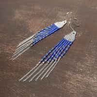 Succombez au charme bohème et élégant de ces boucles d'oreilles tissées à la main, de couleur bleu cobalt. De fines chaînettes en argent ajoutent une touche aérienne et scintillante.