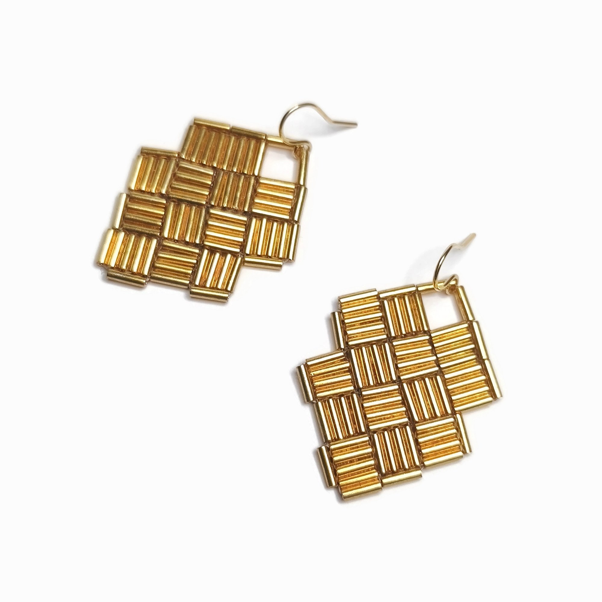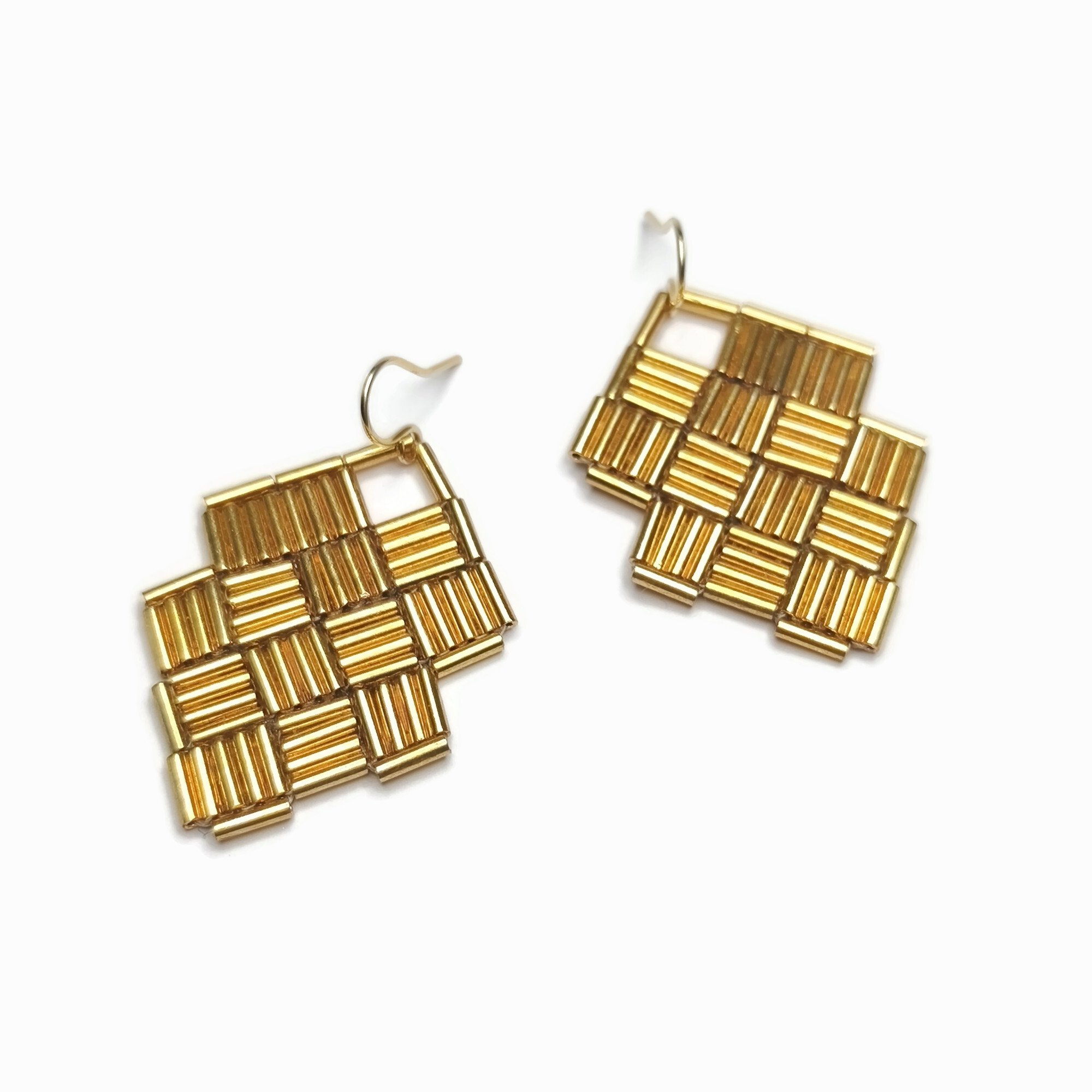 Découvrez ces boucles d’oreilles tissées à la main en perles de verre, composées d’un motif géométrique à damier au graphisme subtil. Le jeu de contrastes et de transparence capte la lumière et anime délicatement le visage.
