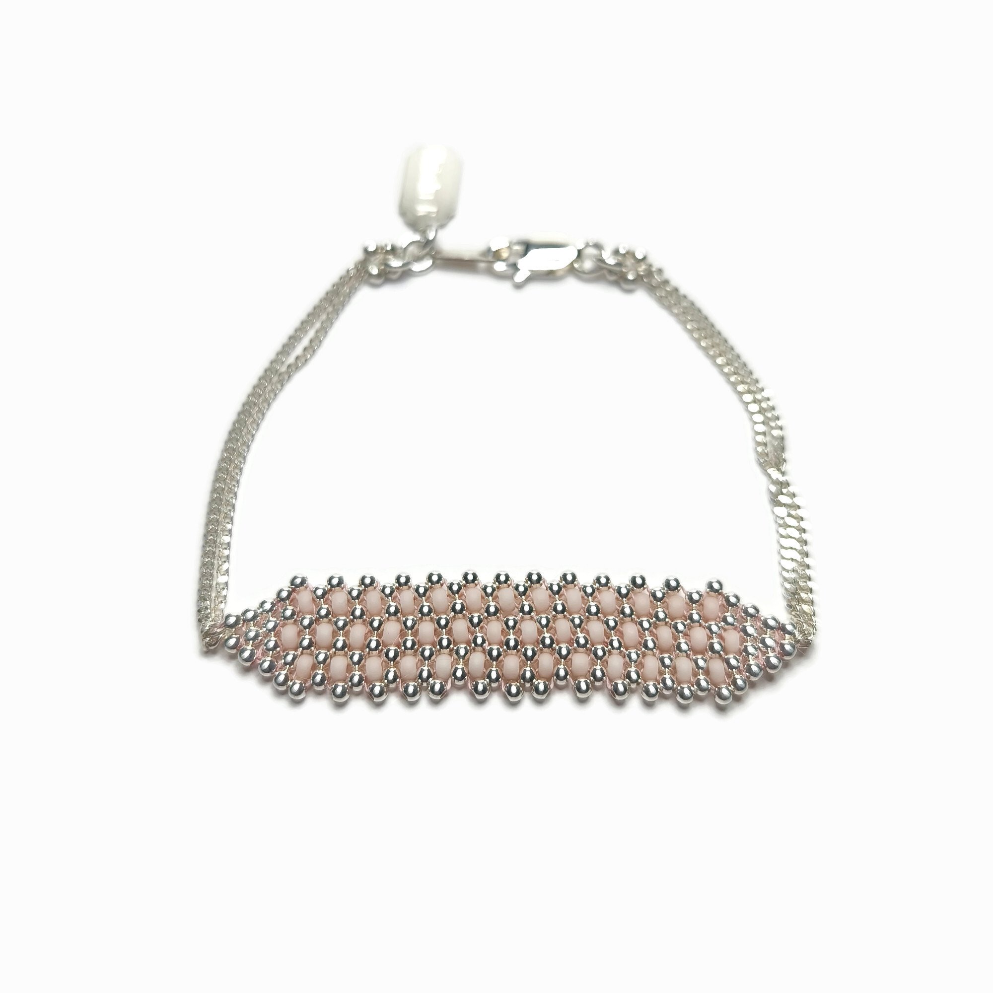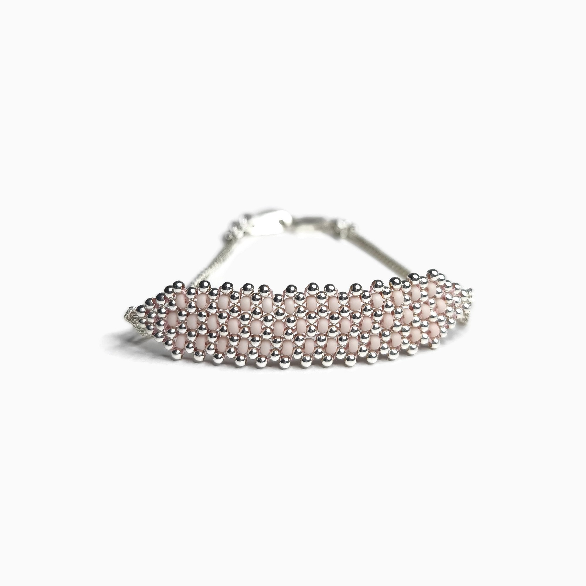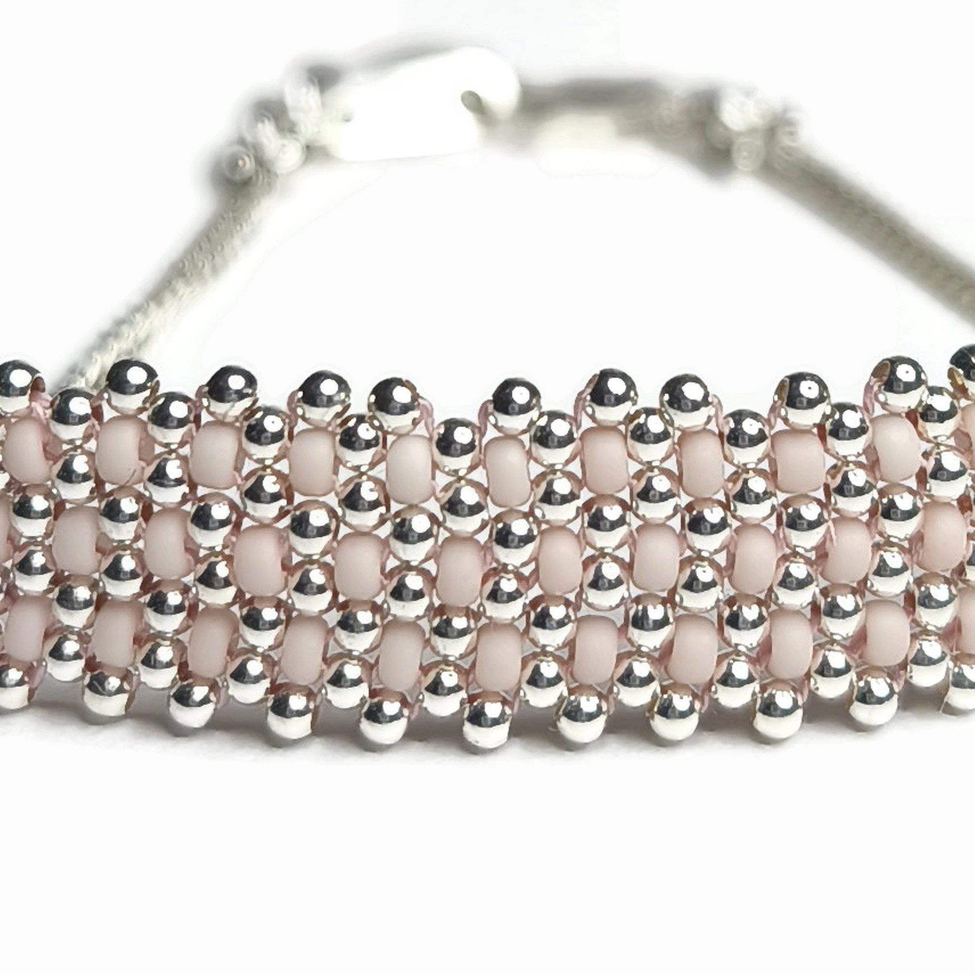 Apportez une touche délicate à votre poignet avec ce bracelet raffiné composé de perles de rocaille rose pastel et de petites boules en argent sterling.