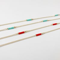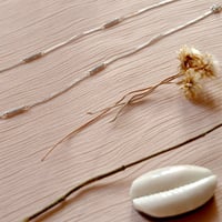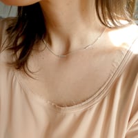 La photo portée présente le collier en version 37.5 cm - 42 cm / Gris clair.